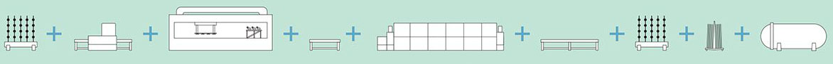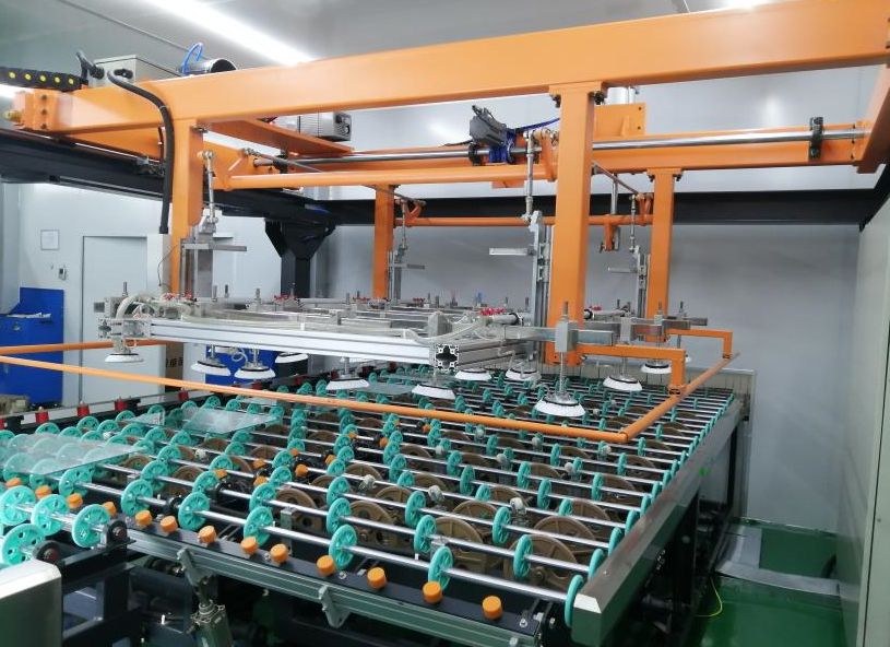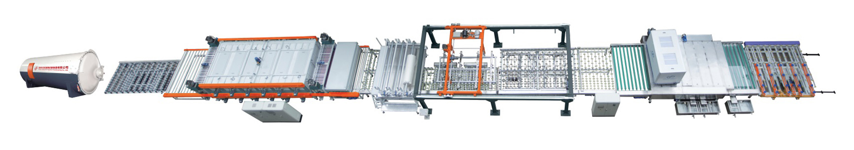 主要由自動上片臺、清洗干燥機、合片定位輸送機、自動行走吸盤吊架、PVB 膠膜鋪攤機、合片房、預壓機、下片臺、蒸壓釜等組成。